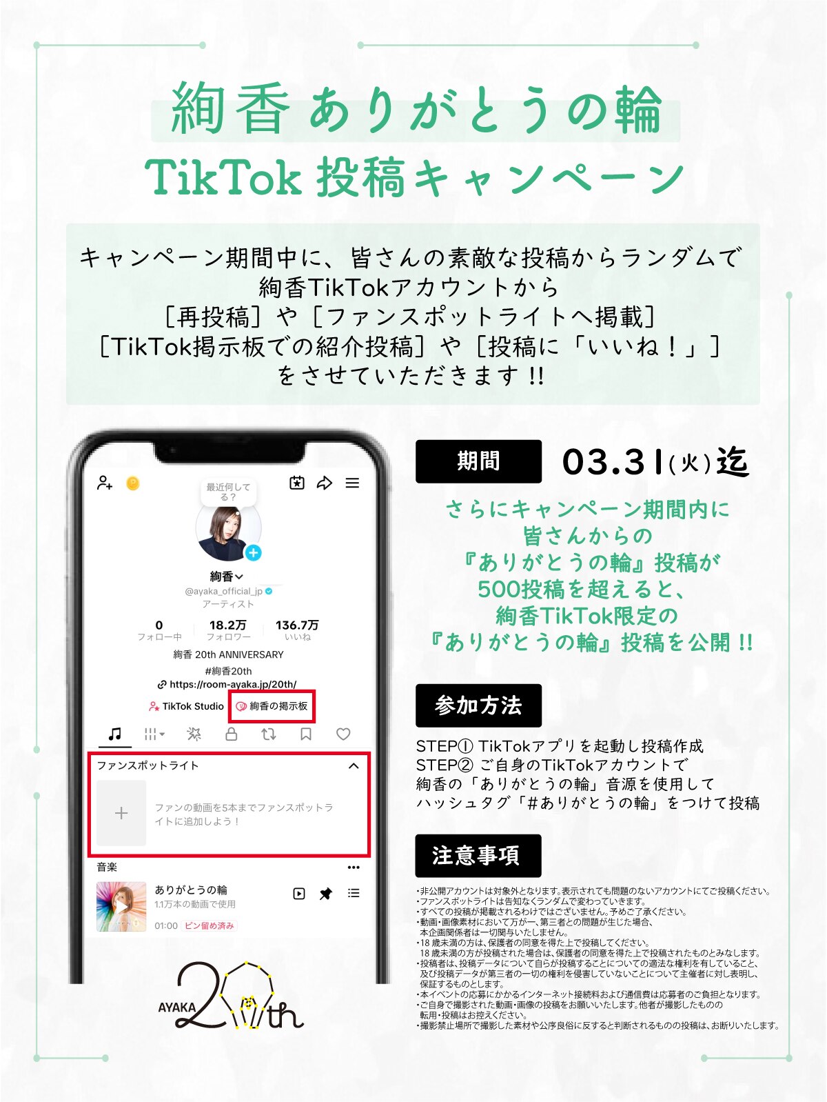 ※ぜひ絢香公式アカウント(https://www.tiktok.com/@ayaka_official_jp)をメンションしてください。